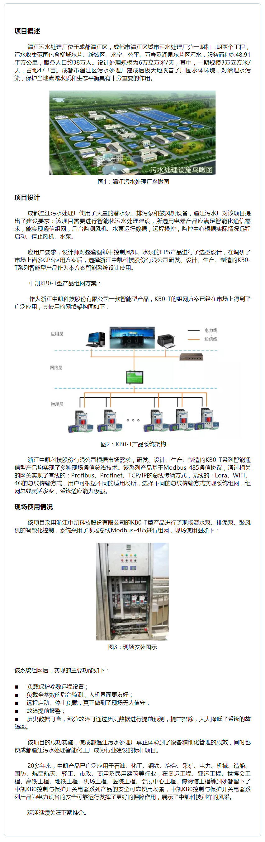 中凱KB0-T智能型產(chǎn)品在成都溫江污水處理管理系統(tǒng)中的應(yīng)用